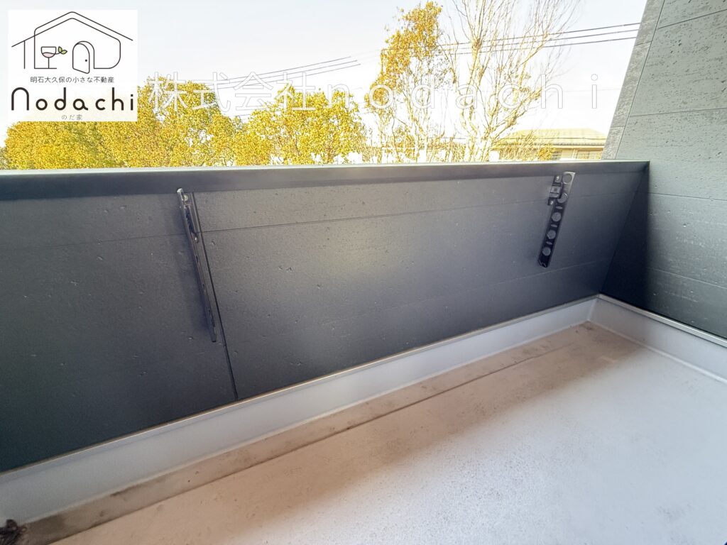 手すり壁がしっかり立ち上がっており、外からの視線を抑えつつ安心感があります。日当たりも良く、洗濯物が気持ちよく乾くのも嬉しいポイント😊