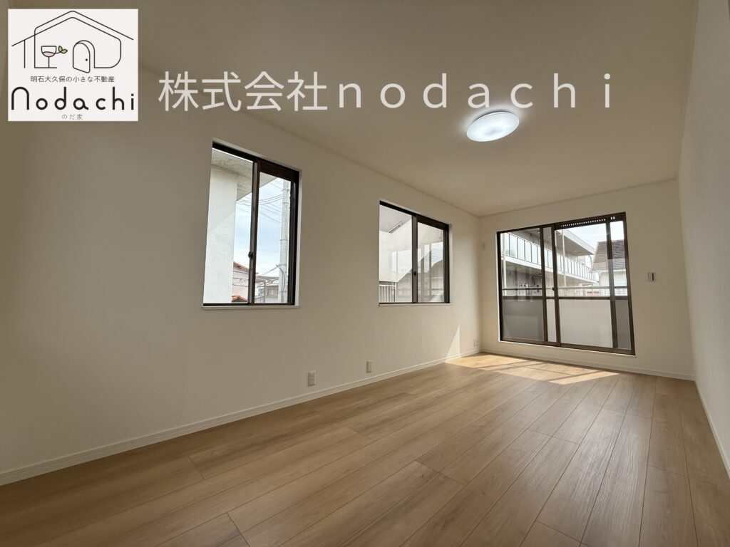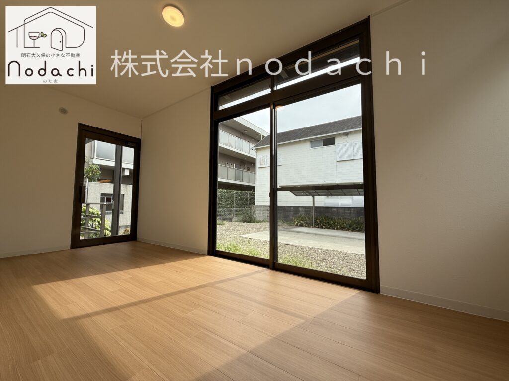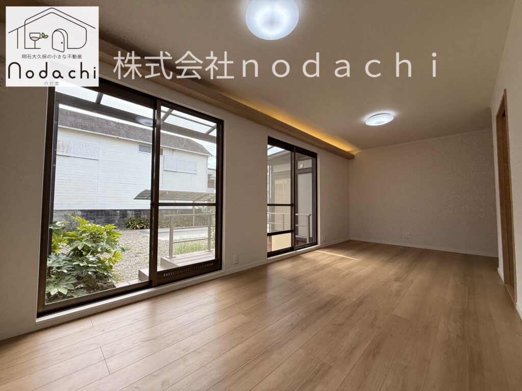 大きな窓から自然光がたっぷり注ぐ、開放感あふれる16帖のLDK。明るいフローリングとシンプルな内装が、どんな家具とも相性抜群です。さらに天井には間接照明が設けられており、日中は自然光で明るく、夜は柔らかな光が室内を包み込みます✨ リビングと庭がつながる設計で、家族の団らんやお子様の遊び場としても最適。ゆとりある空間が、暮らしをより上質に演出します。