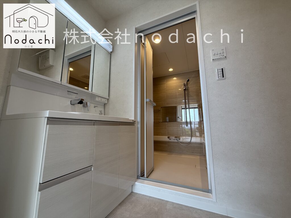 清潔感あふれる洗面化粧台は三面鏡タイプで、収納力も抜群✨ 毎日の身支度やスキンケアも快適に行えます。引き出し収納が豊富なので、タオルや洗面用品もすっきり整理可能。横には浴室が隣接しており、家事や生活動線がスムーズなのも魅力です🚿 明るく広さを感じられる空間設計で、家族みんなが気持ちよく使える洗面所です。