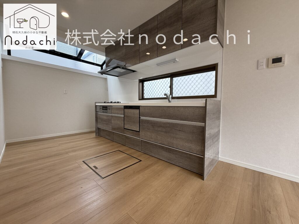 木目調のシステムキッチンは落ち着いた雰囲気で、LDK全体と調和するデザイン。ワイドな作業スペースと豊富な収納を備えており、毎日の料理を快適にサポートしてくれます🍳✨ 上部の吊戸棚や床下収納もあり、調理器具や食材をすっきり整理できます。窓や天窓から自然光が入り込むので、明るく風通しの良い空間で気持ちよくお料理ができます。