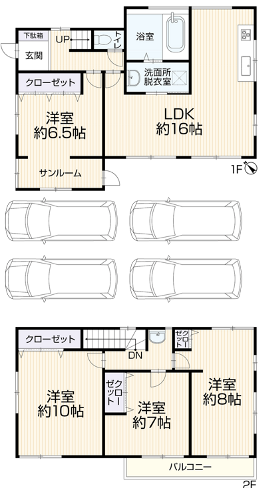 本物件はゆとりの4LDK+サンルーム付き。1階は南面の駐車場に面しているため採光良好な16帖LDKと洋室6.5帖、サンルームがあり家族が集う快適空間。2階は洋室10帖・8帖・7帖の広々設計で収納も充実。ご家族構成に合わせて多彩に使える間取りです。