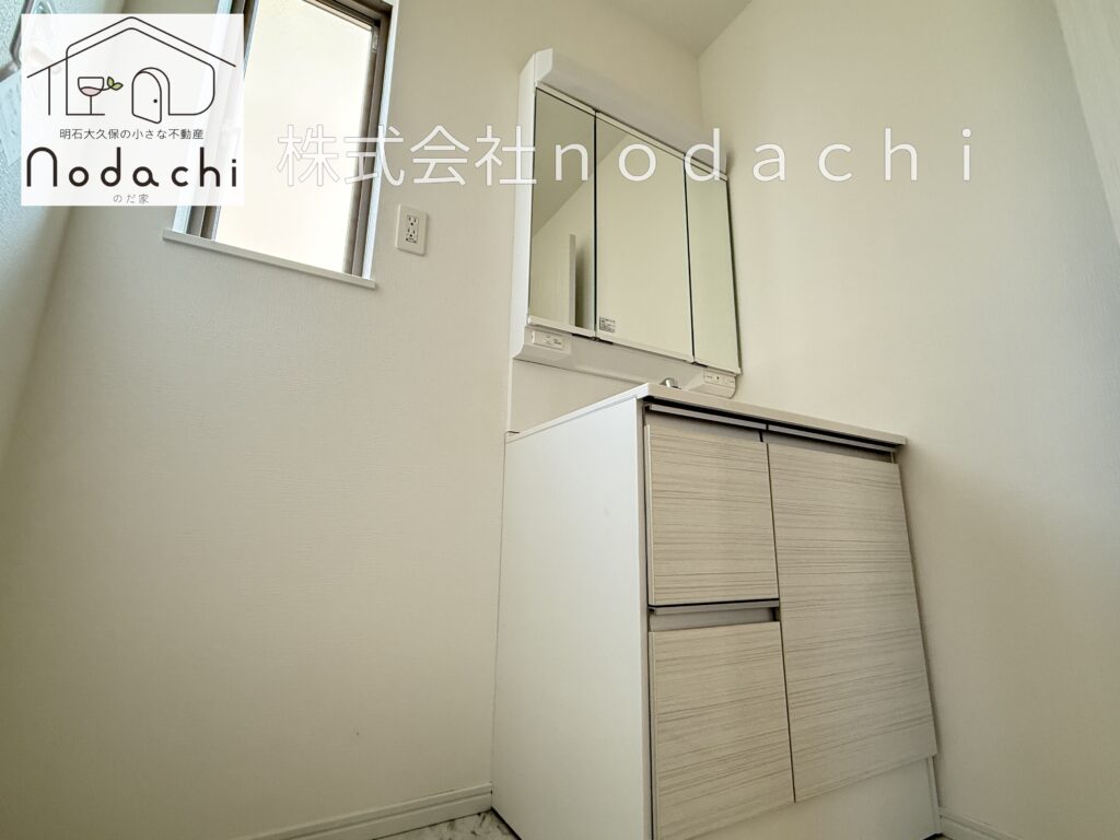 白を基調とした明るく清潔感のある洗面室は、日々の身支度を気持ちよくサポートしてくれる空間です🏠三面鏡タイプの洗面化粧台を採用しており、鏡の裏には小物をスッキリ収納できるので、忙しい朝もスムーズに準備が整います。窓からは優しい自然光が差し込み、換気もしやすく湿気がこもりにくいのも嬉しいポイント🫧洗面台下や周辺のスペースを上手に活用すれば、タオルや洗剤のストックも機能的に収まります。