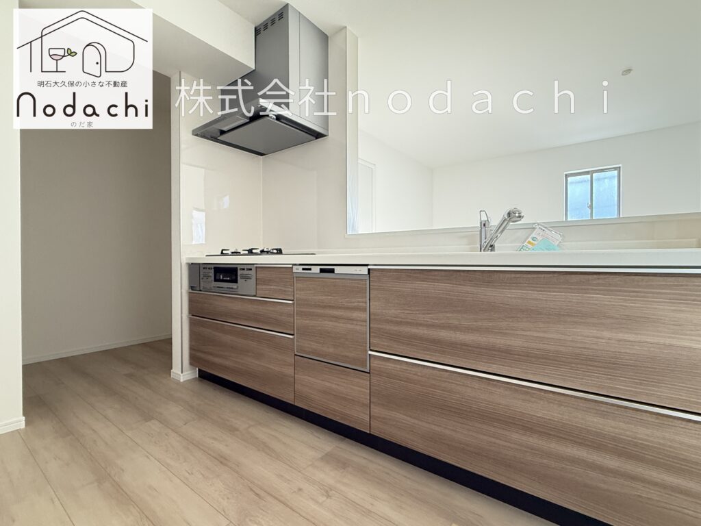 お料理中も家族の笑顔が見える開放的な対面式システムキッチンです✨木目調の落ち着いたデザインがフローリングとも素敵にマッチし、空間全体に統一感を与えています🏠毎日使う場所だからこそ使い勝手にはとことんこだわっており、食後の片付けがラクラク時短になる食洗機や、お料理の効率が上がる三口ガスコンロを完備しました🔥背後には約1.85帖のパントリーを備えているので、ストック品や調理器具もスッキリと収納できてキッチン周りはいつも美しく保てます🍽️