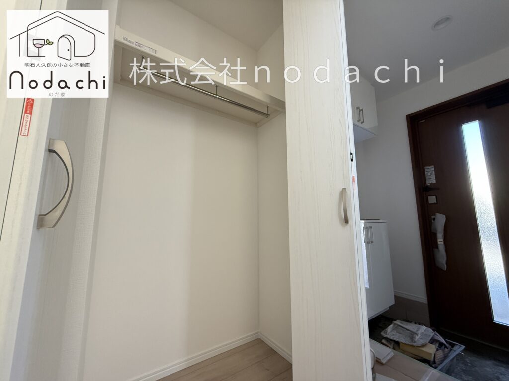 玄関を入ってすぐの場所に配置された物入は、外出時や帰宅時の動線を格段にスムーズにしてくれる便利なスペースです🏠内部にはハンガーパイプと枕棚が備わっているため、お出かけ用のコートをサッと掛けたり、置き場所に困る大きな荷物や日用品のストックをスッキリと収納したりできます。お部屋の中に持ち込みたくない上着なども玄関先で片付けられるので、居室をいつも清潔で広々と保てるのが嬉しいポイントです。
