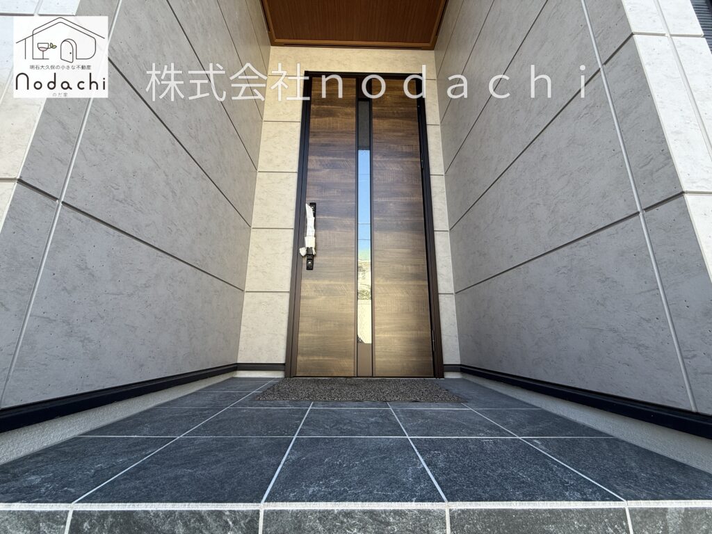 重厚感のある木目調玄関ドアが印象的なエントランス✨縦スリットのガラスから自然光を取り込み、明るさと防犯性を両立しています🔐足元は高級感のある大判タイル仕上げで、ゆとりあるポーチ空間を確保。雨の日の出入りも安心できる、上質さを感じる玄関です🏡