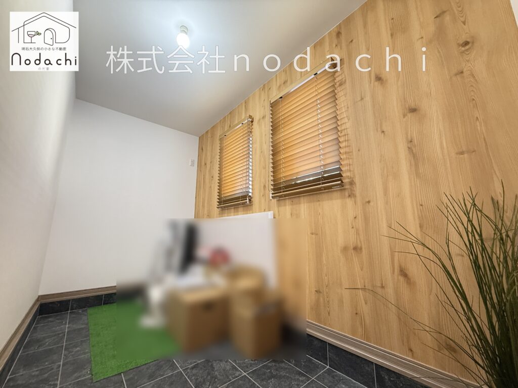 玄関横に設けられたゆとりある土間収納✨床はタイル仕上げで、外からそのまま荷物を持ち込める使い勝手の良い空間です🚲⛺自転車やベビーカー、アウトドア用品も置ける広さがあり、趣味の道具もしっかり収納可能。木目調のアクセントクロスが温かみを演出し、機能性とデザイン性を兼ね備えた便利なスペースです🏡