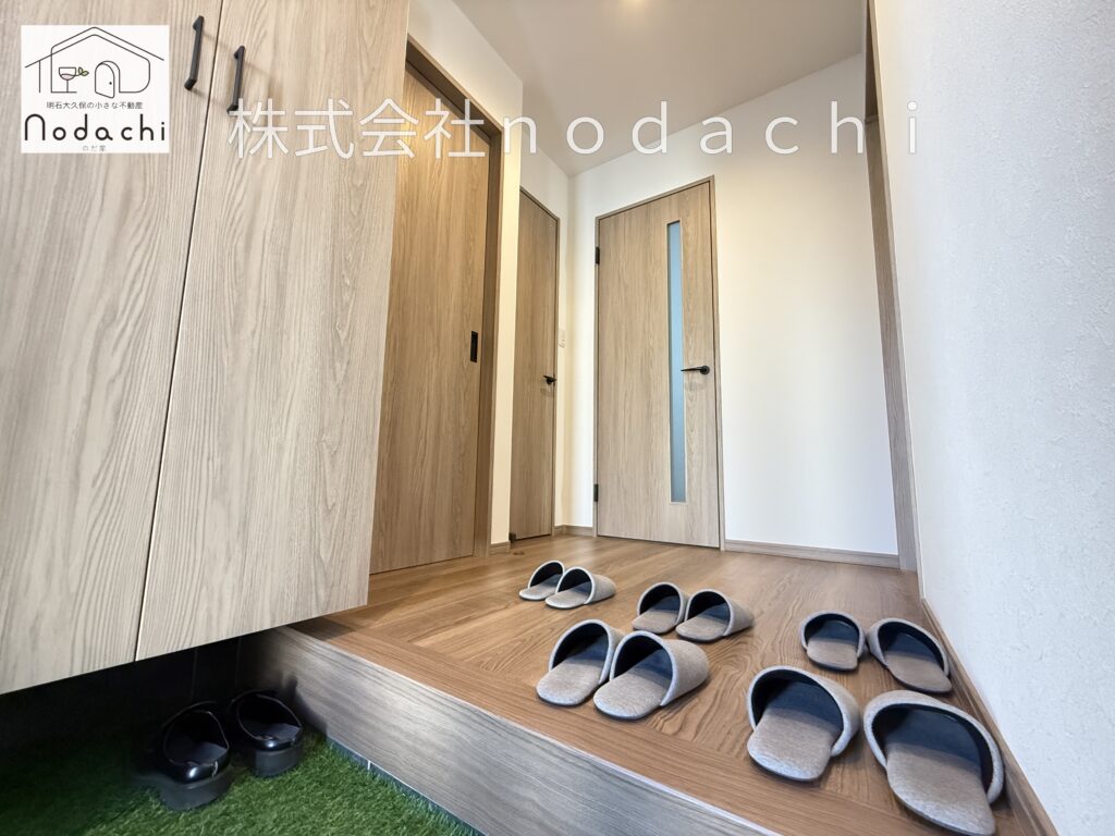 木目で統一された温かみのある玄関ホール✨上がり框はゆとりがあり、ご家族で並んで靴の脱ぎ履きができます👟収納も大容量で、玄関まわりをすっきり保てる設計。正面の縦スリット入りドアから光が入り、明るく開放感のある空間に。来客時も好印象を与える、上質感のあるエントランスです🏡