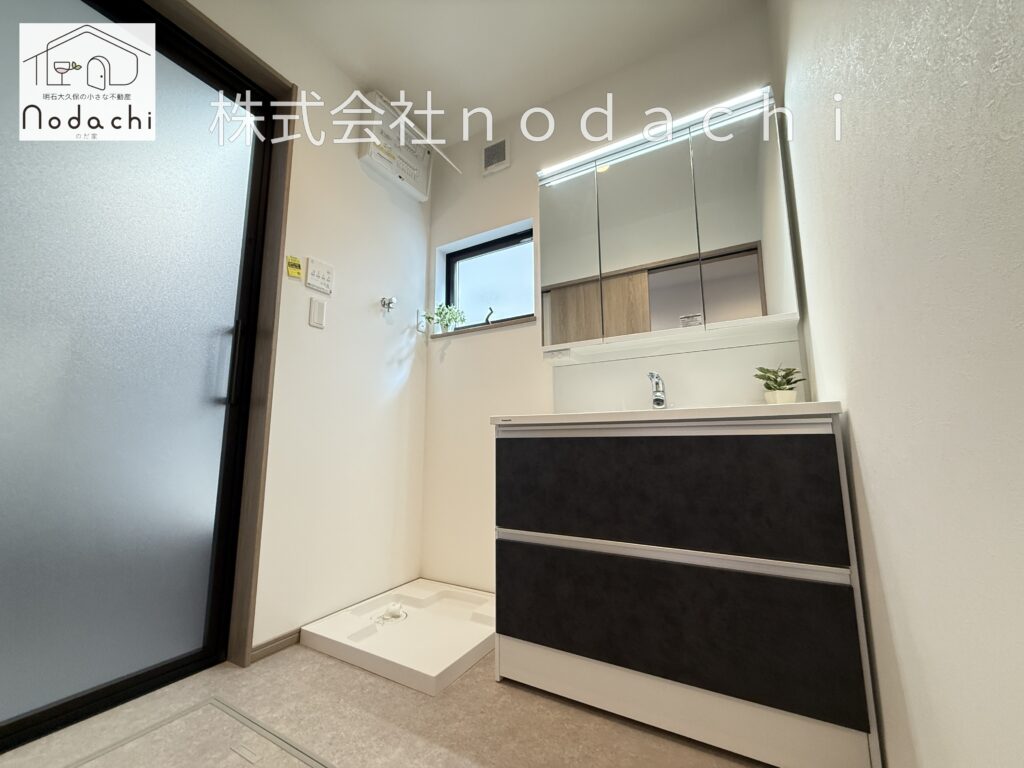 スタイリッシュな洗面化粧台✨三面鏡タイプで収納力もあり、洗面まわりをすっきり保てます🪞LED照明付きで朝の身支度も快適。ワイドなボウルは使い勝手が良く、お掃除もしやすい設計です。窓があり自然光と換気も確保。洗濯機置場もゆとりがあり、家事動線に配慮された清潔感あふれる空間です🏡