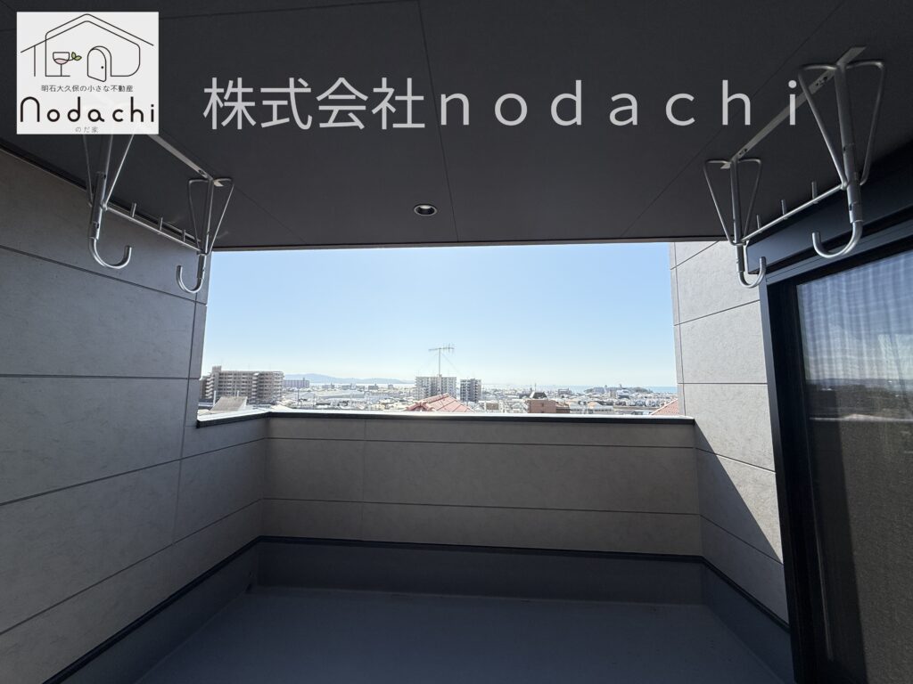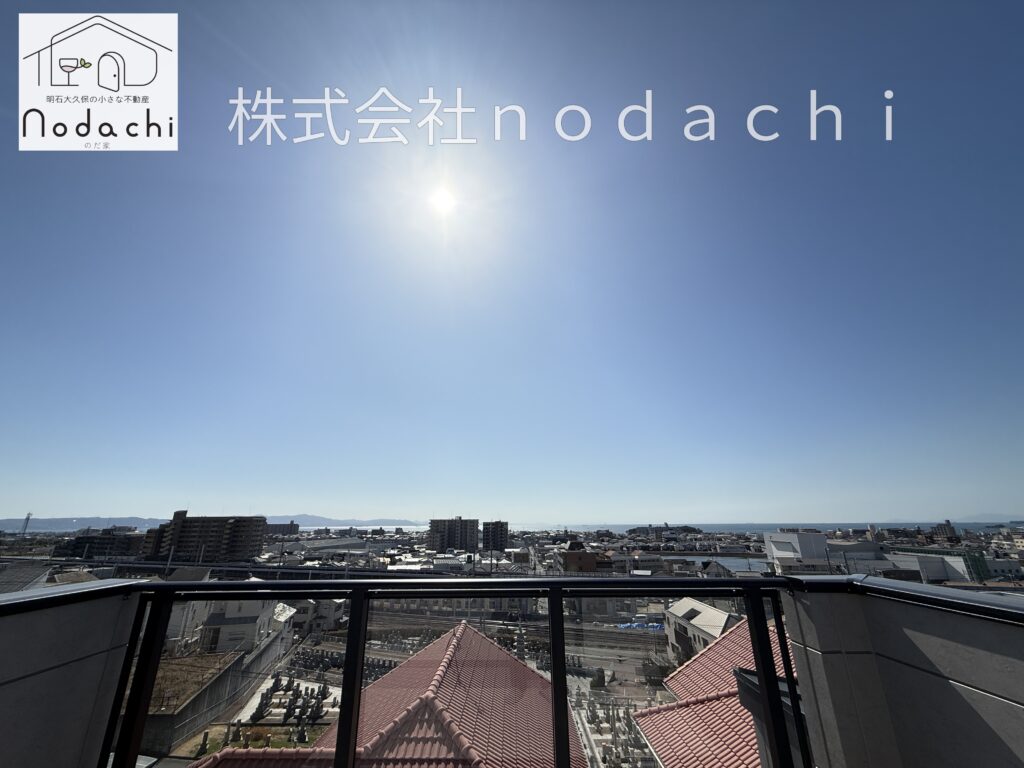 開放感あふれるルーフバルコニーからの眺望🌊✨視界を遮るものが少なく、空と街並み、そして明石海峡を望む贅沢なロケーションです。晴れた日は青空と海のコントラストが美しく、時間帯によって表情が変わる景色を楽しめます🌞🌇ご自宅にいながらリゾート気分を味わえる、特別感のあるプライベート空間です🏡
