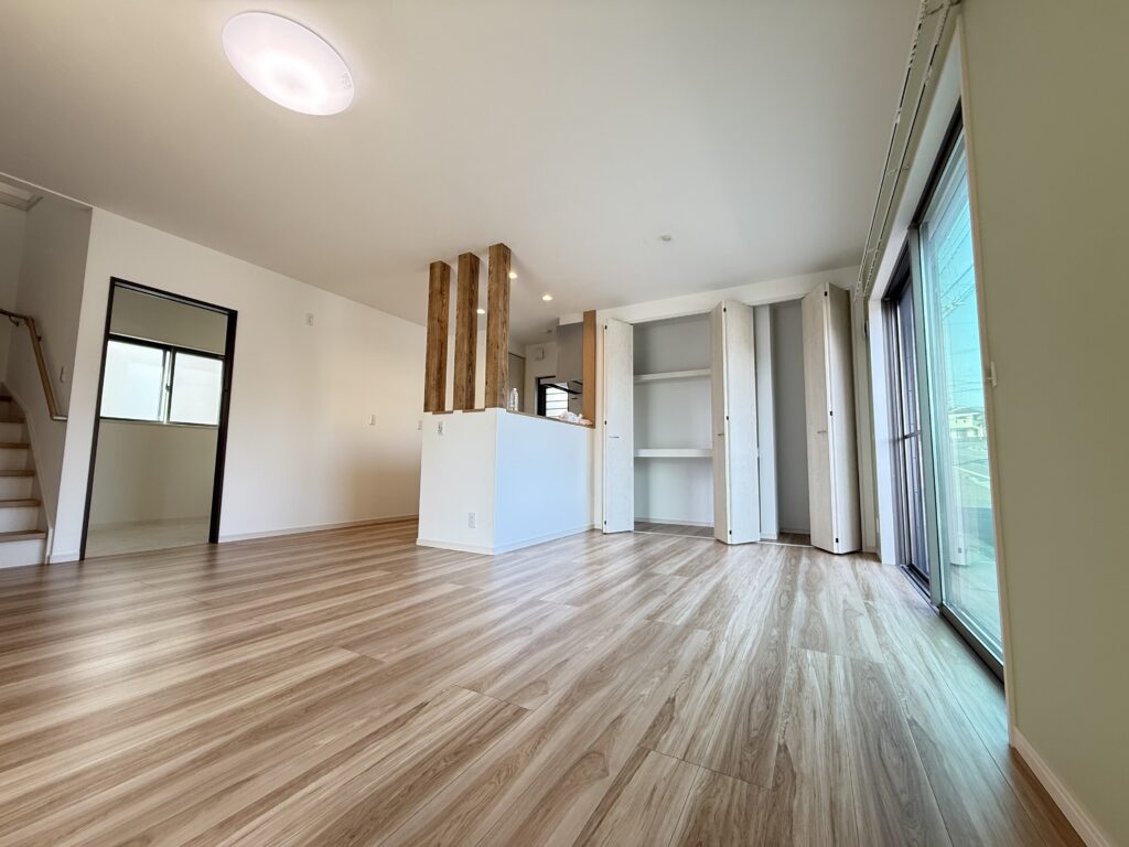 約18.5帖の広々LDKは、家族が自然と集まる明るく開放的な空間😊