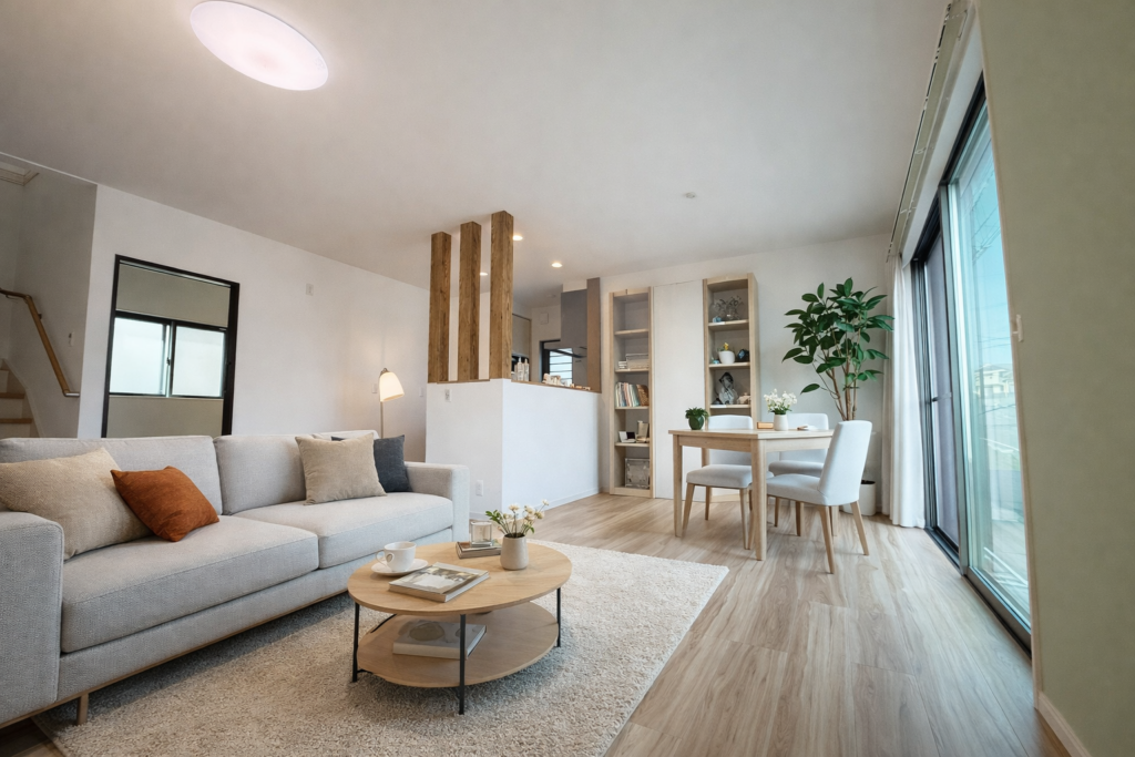 ソファやダイニングを置いてもゆとりがあり、家族でくつろぐ空間と食事スペースをしっかり確保できます🌿