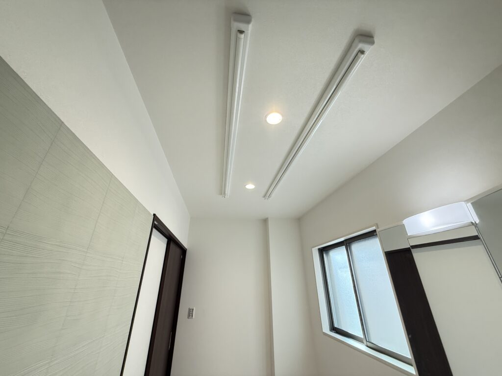 天井には可動式の室内物干しを設置し、雨の日や花粉の季節も安心😊