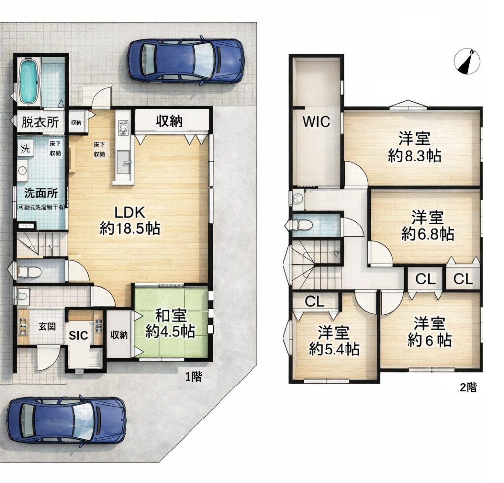 1階は約18.5帖の広々LDKに和室4.5帖を配置し、家族が集まりやすい動線😊