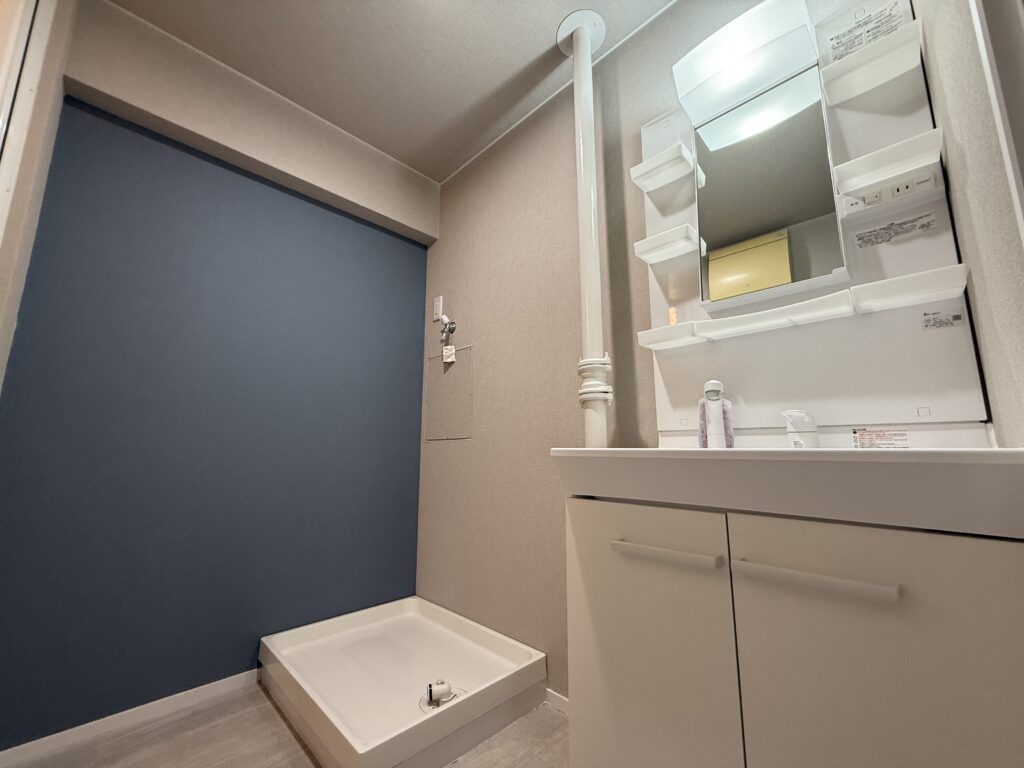 洗面台は新調され、白を基調とした明るく清潔感のあるデザイン✨。大きなミラーとサイドの収納棚が備わっており、洗面用品や化粧品をすっきり整理できます。足元収納もたっぷりで機能性抜群。背面のネイビーカラーのアクセントクロスが落ち着きを演出し、毎日の身支度を快適にしてくれます🚿。