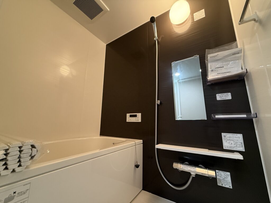 浴室はリフォームで新調され、ダークブラウンのアクセントパネルが高級感を演出🛁✨。浴槽はゆったり浸かれるサイズで、追い焚き機能やシャワー設備も整っており快適。壁面にはミラーや収納棚も設置され、使い勝手も抜群です。落ち着いた雰囲気の中で、一日の疲れを癒すリラックスタイムを過ごせます🌙。
