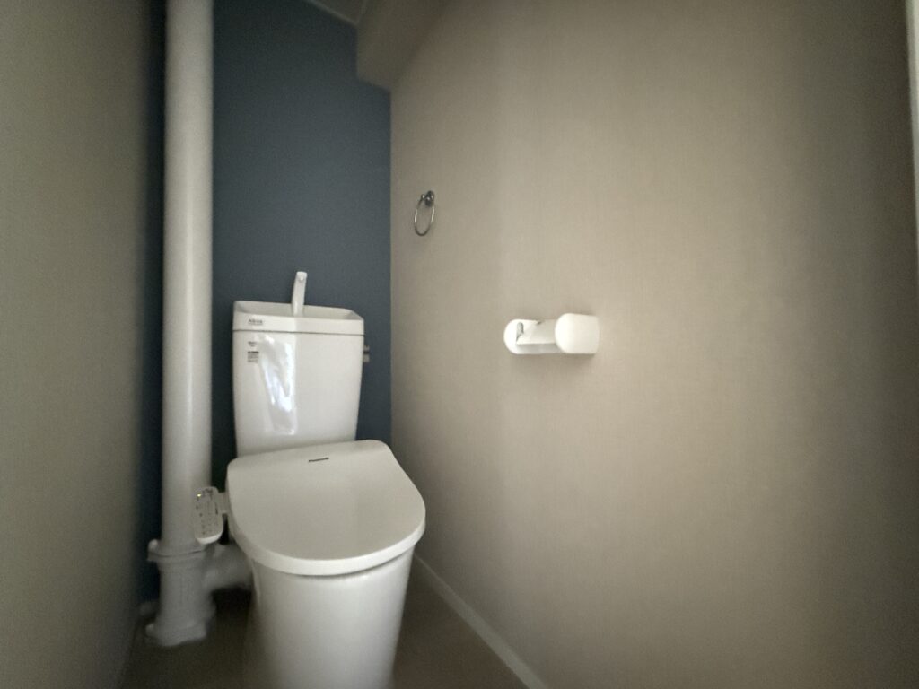 トイレはウォシュレット付きに新調され、清潔感あふれる空間🚽✨。白を基調にしつつ、背面のブルーアクセントクロスが落ち着きをプラスしています。シンプルで機能的なデザインで、日々の暮らしを快適にサポートしてくれます。