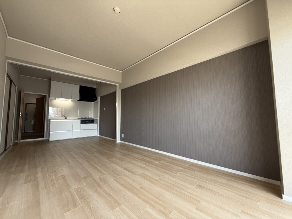 LDKは約12.5帖の広さがあり、南向きバルコニーに面した明るい空間☀️。ナチュラルなフローリングとアクセントクロスが調和し、落ち着きと温かみを感じられます。奥には新調されたシステムキッチンが配置され、家族との会話を楽しみながら料理ができる開放的な設計です🍳。