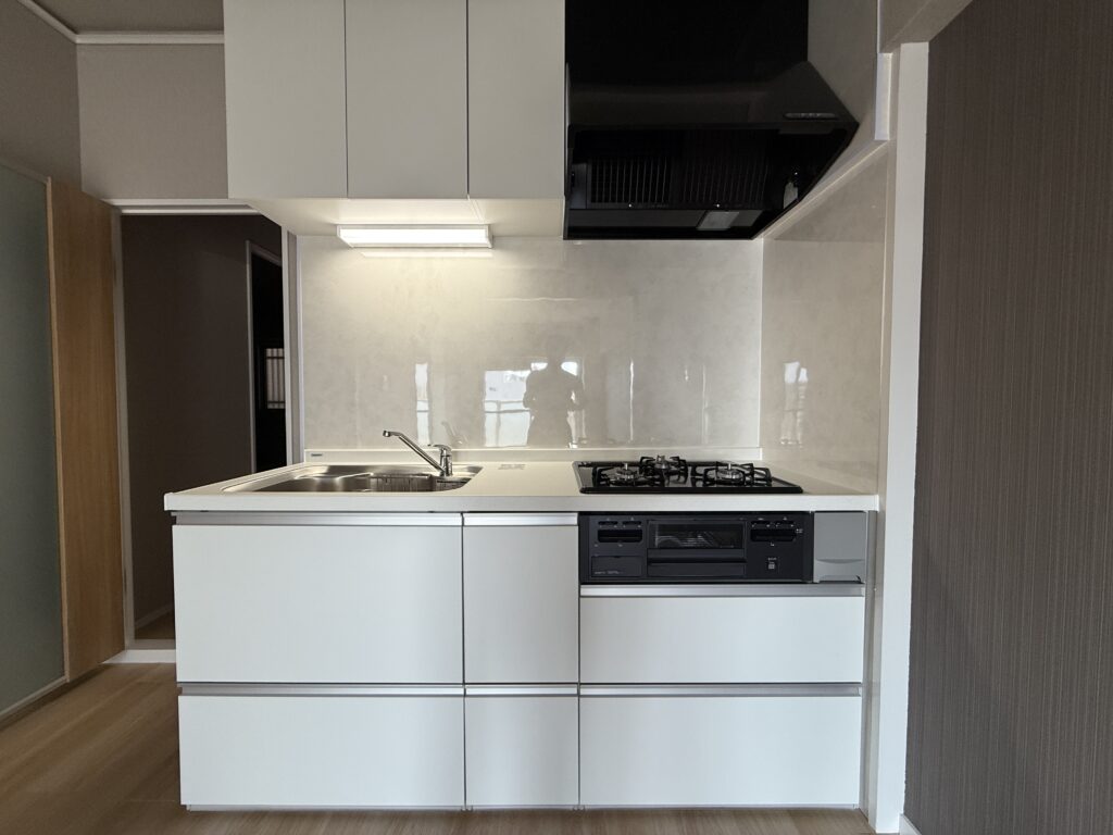 キッチンはリフォームで新調され、白を基調とした清潔感あふれるデザイン✨。三口コンロとグリル付きで料理の幅も広がります🍳。収納も上下にしっかり備わっており、調理器具や食器をすっきり片付けられるのも嬉しいポイントです。シンプルながら機能性に優れた使いやすいキッチンです。