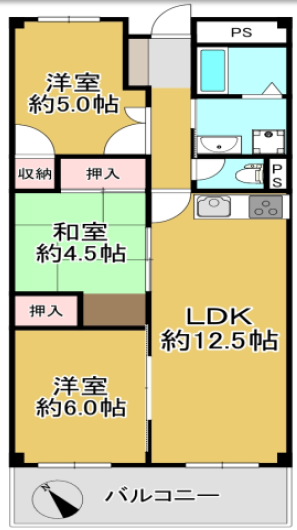 間取りは3LDK、専有面積64.96㎡。南西向きのバルコニーに面した約12.5帖のLDKは明るく開放感があり、家族が集まりやすい空間です。洋室は5.0帖と6.0帖、さらに4.5帖の和室を備え、ライフスタイルに合わせて多目的に活用可能。収納スペースも各部屋に確保されています。