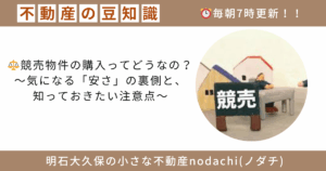 👨💼ノダチ:こんにちは!明石大久保の小さな不動産「nodachi」です😊今日はお客様からよくいただくご質問のひとつ、「競売物件って安いって聞くけど、実際どう […]