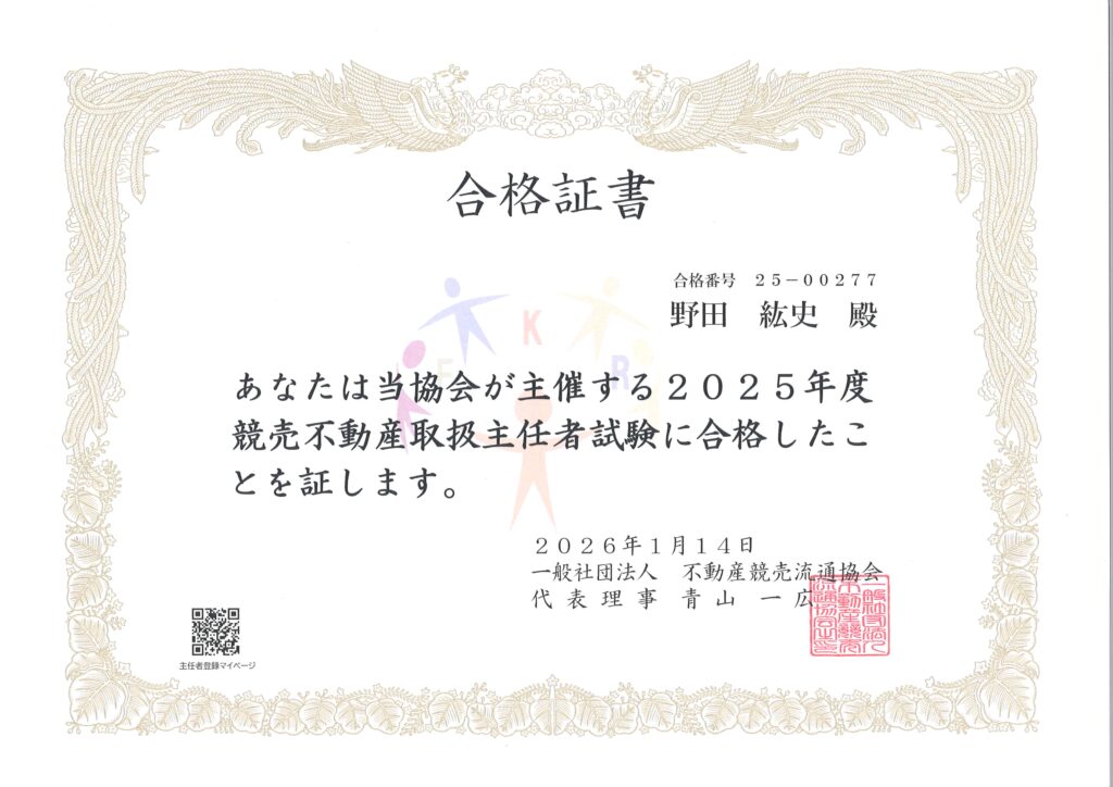 この度、「競売不動産取扱主任者」の資格を取得いたしました 🎓✨